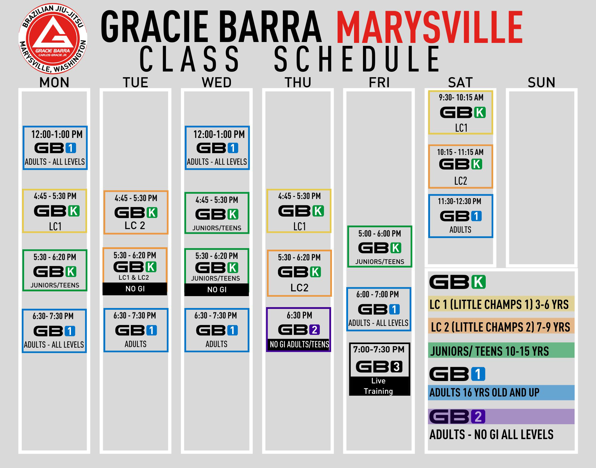 Below is the class and training schedule for our Gracie Barra Marysville, Washington Location. The different designations for each class and their descriptions can be found on OUR PROGRAMS page. Please note that a “1 FREE CLASS” trial is available for any class you like to see if we are a good fit for you. We look forward to hearing from you and hope to see you soon.