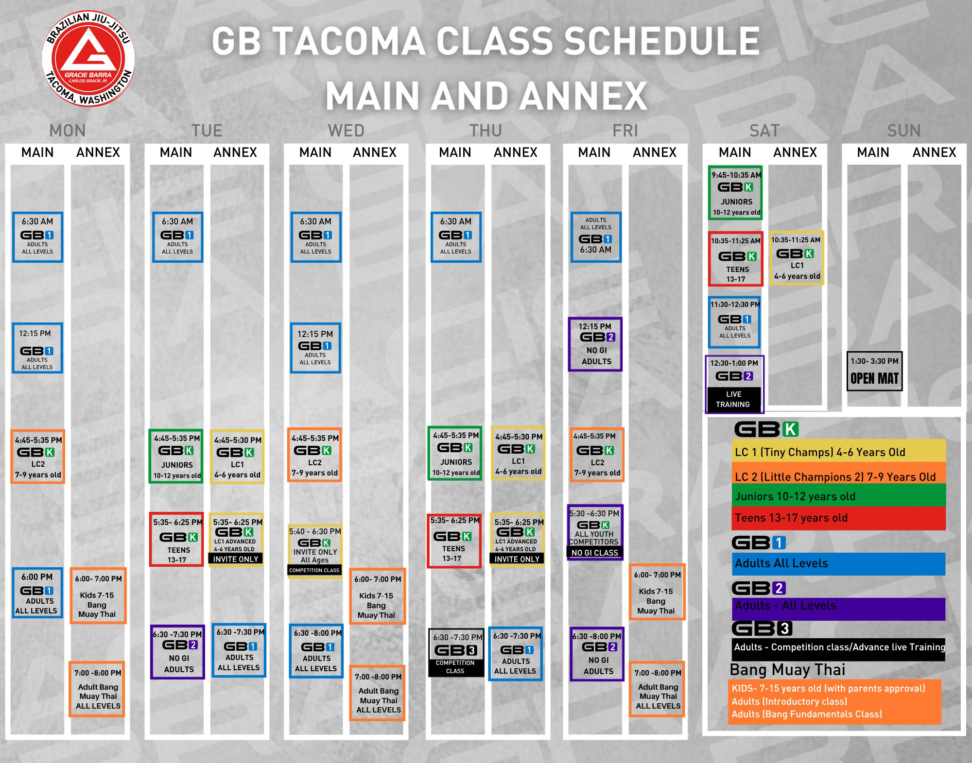 Below is the class and training schedule for our Gracie Barra Tacoma, Washington Location. The different designations for each class and their descriptions can be found on OUR PROGRAMS page. Please note that a “1 FREE CLASS” trial is available for any class you like to see if we are a good fit for you. We look forward to hearing from you and hope to see you soon.